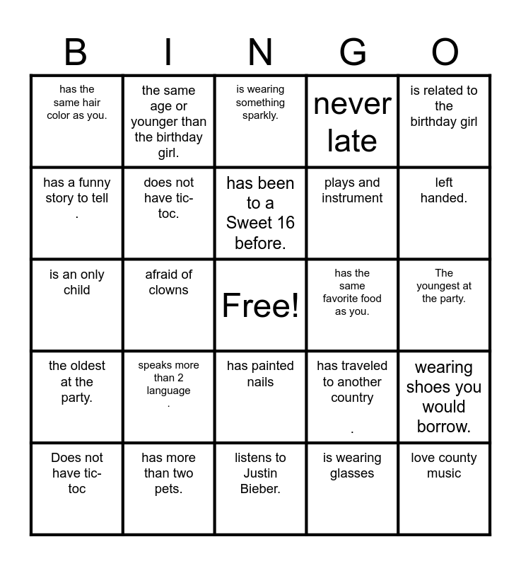 This bingo card has a free space and 29 words: Does not have tic-toc, wearing white, afraid of clowns, knows 2 or more languages, has the same hair color as you., is wearing something sparkly., does not have tic-toc., speaks more than 2 language ., has the same favorite food as you., has more than two pets., The youngest at the party., love county music, listens to Justin Bieber., is wearing glasses, left handed., has a birthday in the same month as you., has painted nails, the oldest at the party., is related to the birthday girl, is an only child, has traveled to another country ., Does not like chocolate, plays and instrument, has a funny story to tell ., never late, the same age or younger than the birthday girl., wearing shoes you would borrow., has been to a Sweet 16 before. and has known you for 5 years..