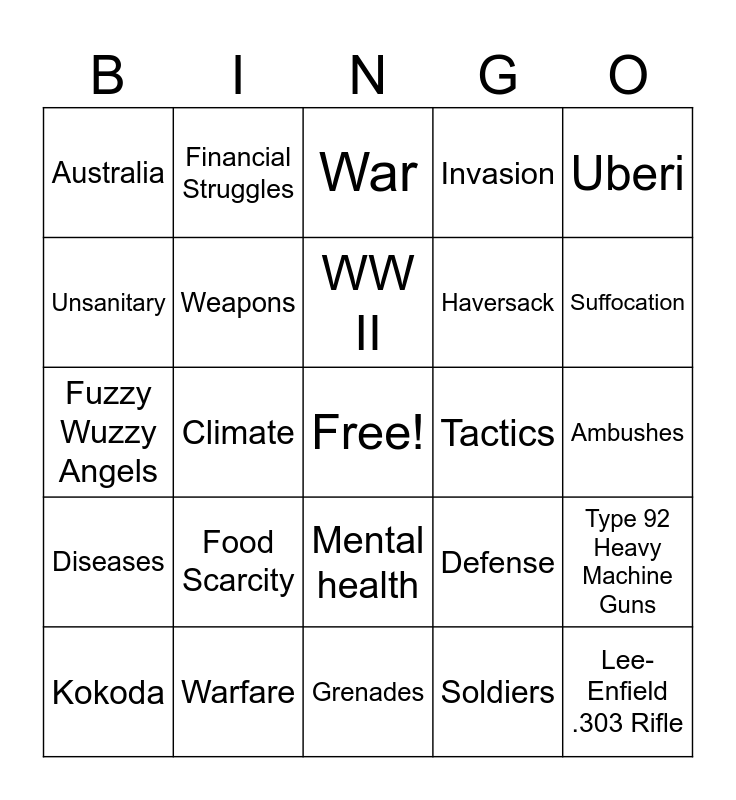 This bingo card has a free space and 29 words: Kokoda, Terrain, Climate, Japanese, Australia, War, Weapons, Food Scarcity, Tactics, Warfare, Ambushes, Lee-Enfield .303 Rifle, Grenades, Soldiers, Suffocation, Death, Mental health, Diseases, Uberi, Fuzzy Wuzzy Angels, Defense, Khaki, Haversack, Unsanitary, Invasion, Financial Struggles, Type 92 Heavy Machine Guns, WW II and Port Moresby..