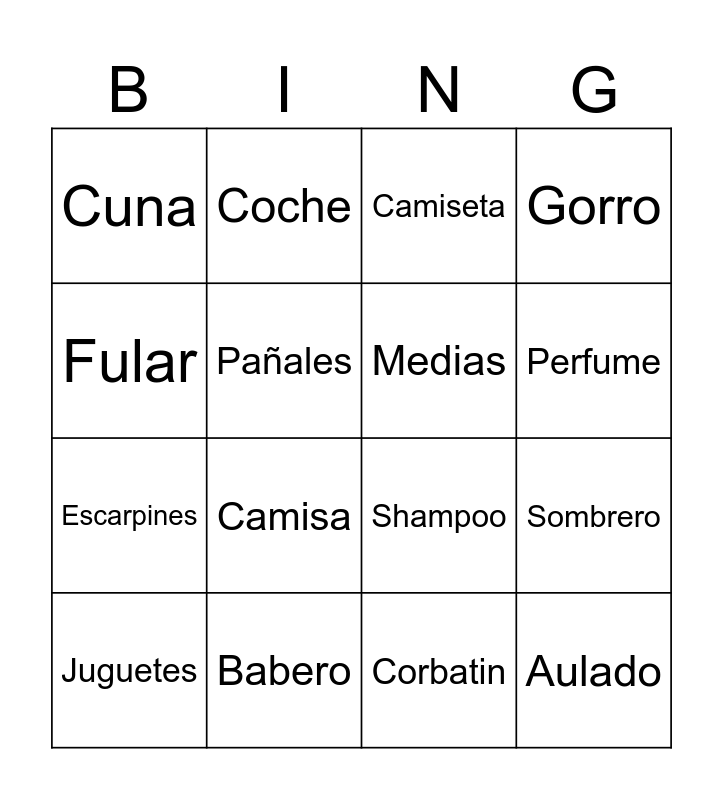 This bingo card has 51 words: Free!, Juguetes, Chilindrin, Talco, Aceite de bebe, Chupon, Coche, Silla de carro, Pañales, Cremita, Medias, Gorro, Zapatos, Guantes, Peluche, Abrigo, Perfume, Babero, Bañera, Fular, Sombrero, Sabanas, Cuna, Escarpines, Pañalera, Termometro, Camisa, Pantalon, Pantaloneta, Camiseta, Calsoncito, Silla de comer, Hamaca, Monitor, Saca Leche, Chupeta, Formula, Mameluco, Bola, Saquito de Dormir, Corbatin, Aulado, Cobija, Mañanitas, Jabon, Aplicadores, Shampoo, Paño, Pañitos, Tuallitas humedas and Pijama.