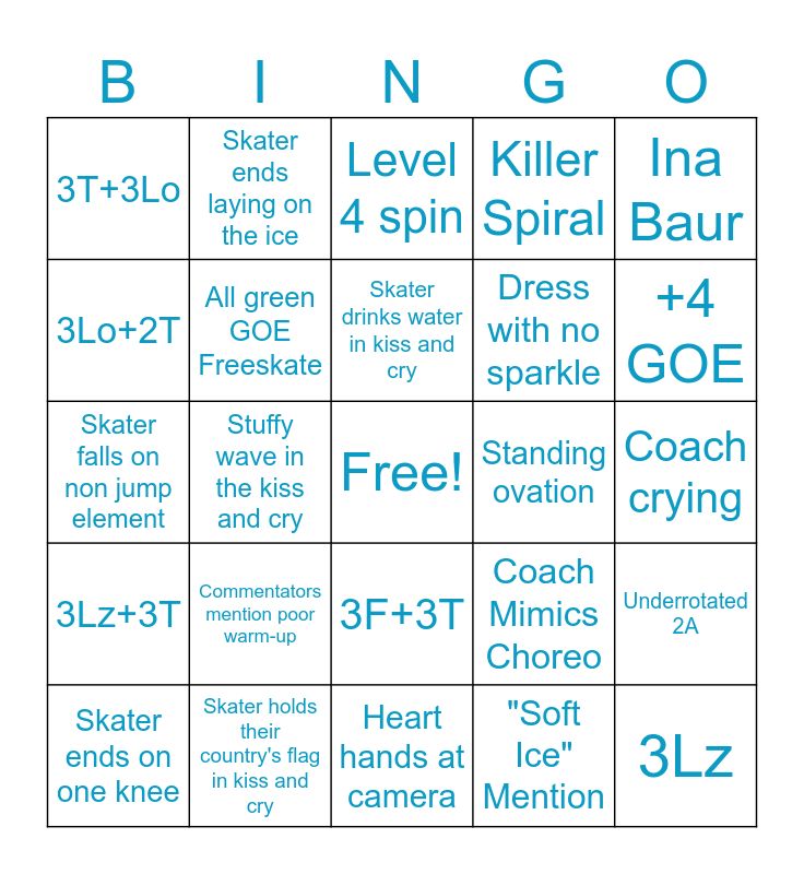 This bingo card has a free space and 31 words: Heart hands at camera, sparkly gloves, Stuffy wave in the kiss and cry, 3A, 3T+3Lo, Level 4 spin, All green GOE Freeskate, Coach Mimics Choreo, Standing ovation, "Soft Ice" Mention, Coach crying, 3Lz, Flutz gets called, Over the boot tights, +4 GOE, Spins lefty and righty, Underrotated 2A, Commentators mention poor warm-up, 3Lz+3T, 3F+3T, Ina Baur, Spread eagle into a jump, Skater ends on one knee, Skater ends laying on the ice, Dress with no sparkle, 3Lo+2T, Killer Spiral, Skater falls on non jump element, Skater holds their country's flag in kiss and cry, Skater drinks water in kiss and cry and Commentators are impressed.