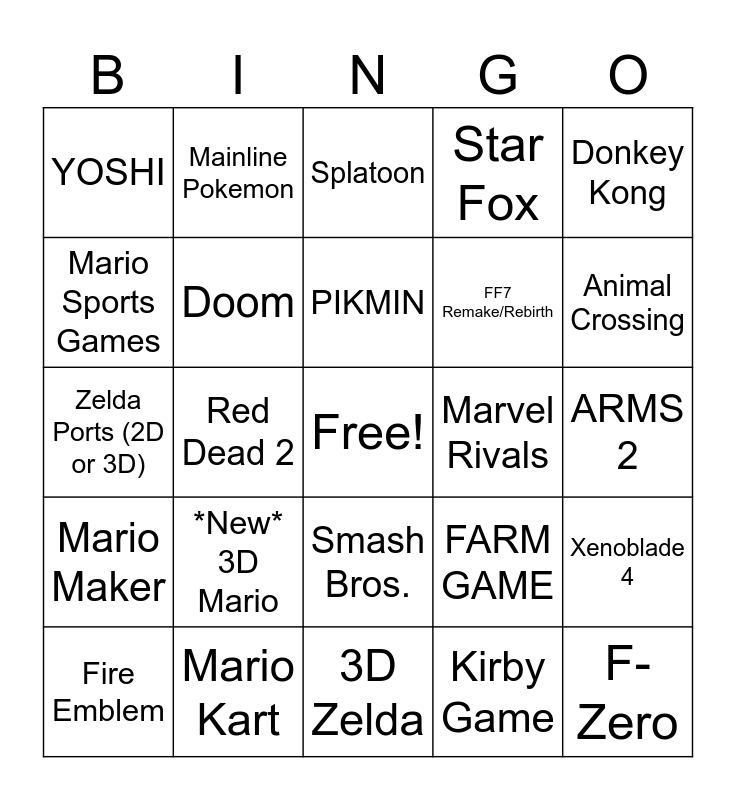 This bingo card has a free space and 24 words: *New* 3D Mario, Mario Kart, PIKMIN, Fire Emblem, Donkey Kong, YOSHI, Mario Sports Games, Mainline Pokemon, Marvel Rivals, Smash Bros., FF7 Remake/Rebirth, Zelda Ports (2D or 3D), FARM GAME, Xenoblade 4, Doom, Kirby Game, ARMS 2, Splatoon, Animal Crossing, Red Dead 2, F-Zero, Mario Maker, Star Fox and 3D Zelda.