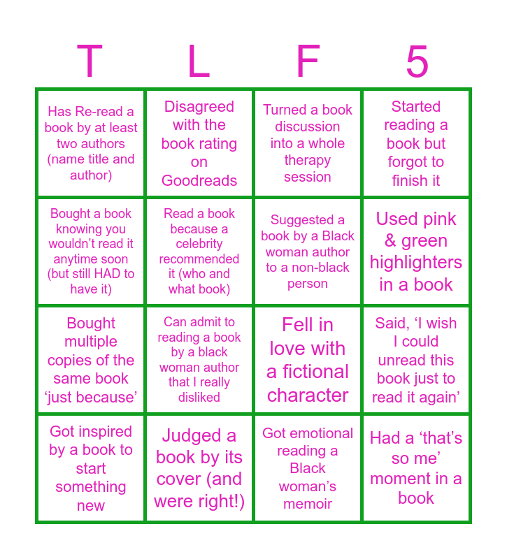 This bingo card has 24 words: Free!, Read a book by a Howard alum author, Got emotional reading a Black woman’s memoir, Had a ‘that’s so me’ moment in a book, Has Re-read a book by at least two authors (name title and author), Disagreed with the book rating on Goodreads, Suggested a book by a Black woman author to a non-black person, Started reading a book but forgot to finish it, Bought multiple copies of the same book ‘just because’, Judged a book by its cover (and were right!), Finished a book in one weekend because it was that good, Used pink & green highlighters in a book, Read a book and immediately wanted to cast the movie version, Was mad at a book ending for DAYS, Fell in love with a fictional character, Had a long discussion about how a book ‘hit different’ as an adult, Got inspired by a book to start something new, Read a book because a celebrity recommended it (who and what book), Has gotten one of our book club selections from a “Bookstagram” page, Said, ‘I wish I could unread this book just to read it again’, Bought a book knowing you wouldn’t read it anytime soon (but still HAD to have it), Can admit to reading a book by a black woman author that I really disliked, Turned a book discussion into a whole therapy session and Selected a book just because the author was a Black woman.