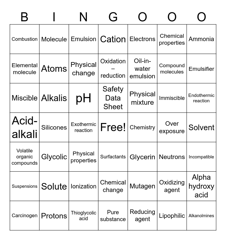 This bingo card has a free space and 62 words: Acidic solution, Acid-alkali, Alkaline solution, Alkalis, Alkanolmines, Alpha hydroxy acid, Ammonia, Anion, Atoms, Carcinogen, Cation, Chemical change, Chemical properties, Chemistry, Combustible, Combustion, Compound molecules, Electrons, Element, Elemental molecule, Emulsifier, Emulsion, Endothermic reaction, Exothermic reaction, Flammable, Glycerin, Glycolic, Hydrophilic, Immiscible, Incompatible, Ion, Ionization, Lipophilic, Matter, Miscible, Molecule, Mutagen, Neutrons, Oil-in-water emulsion, Over exposure, Oxidation – reduction, Oxidizing agent, pH, pH Scale, Physical change, Physical mixture, Physical properties, Protons, Pure substance, Reducing agent, Safety Data Sheet, Silicones, Sodium hydroxide, Solute, Solution, Solvent, Surfactants, Suspensions, Thioglycolic acid, Volatile alcohols, Volatile organic compounds and Water-in-oil emulsions.