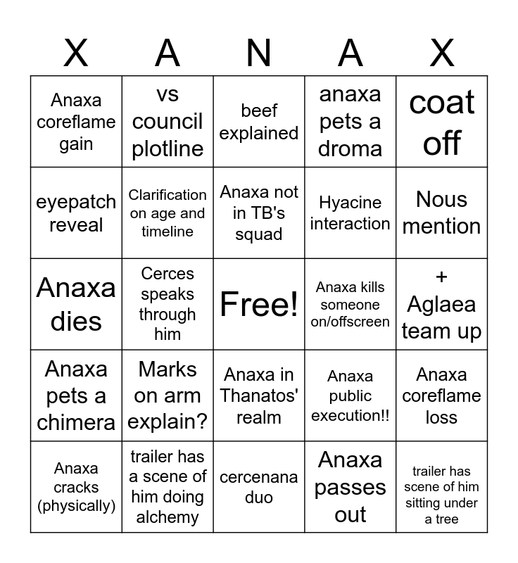 This bingo card has a free space and 24 words: Marks on arm explain?, trailer has a scene of him doing alchemy, Anaxa not in TB's squad, Anaxa cracks (physically), coat off, Anaxa coreflame gain, eyepatch reveal, vs council plotline, Anaxa kills someone on/offscreen, Anaxa in Thanatos' realm, Hyacine interaction, Anaxa dies, Anaxa public execution!!, Anaxa coreflame loss, Clarification on age and timeline, Anaxa passes out, + Aglaea team up, beef explained, Nous mention, Cerces speaks through him, trailer has scene of him sitting under a tree, Anaxa pets a chimera, anaxa pets a droma and cercenana duo.