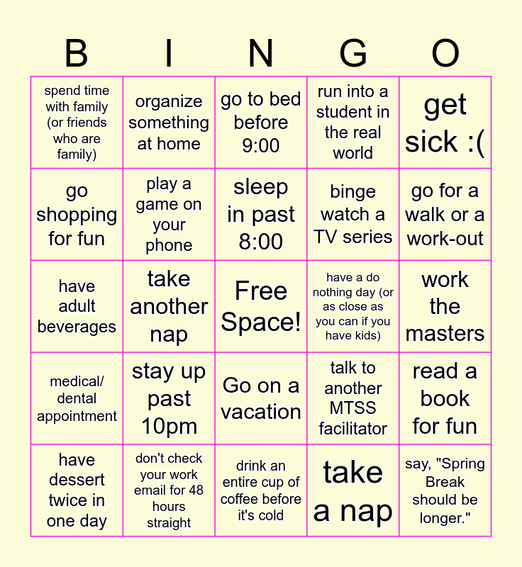 This bingo card has a free space and 24 words: stay up past 10pm, don't check your work email for 48 hours straight, sleep in past 8:00, have dessert twice in one day, get sick :(, spend time with family (or friends who are family), go shopping for fun, organize something at home, have a do nothing day (or as close as you can if you have kids), Go on a vacation, binge watch a TV series, have adult beverages, talk to another MTSS facilitator, read a book for fun, play a game on your phone, take a nap, work the masters, go to bed before 9:00, go for a walk or a work-out, take another nap, say, "Spring Break should be longer.", medical/ dental appointment, run into a student in the real world and drink an entire cup of coffee before it's cold.