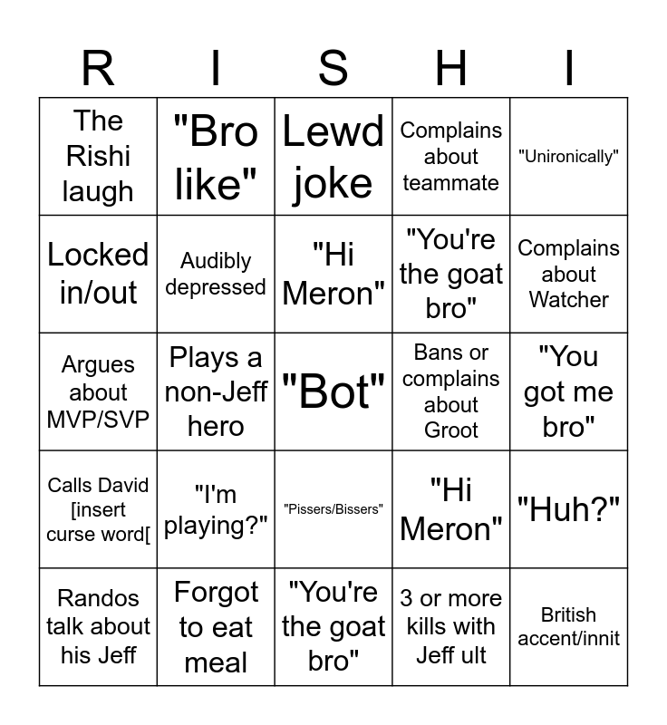 This bingo card has a free space and 24 words: "I'm playing?", Forgot to eat meal, "Hi Meron", Randos talk about his Jeff, "Unironically", The Rishi laugh, Locked in/out, "Bro like", Bans or complains about Groot, "Pissers/Bissers", "You're the goat bro", Argues about MVP/SVP, "Hi Meron", "Huh?", Audibly depressed, 3 or more kills with Jeff ult, "You got me bro", Lewd joke, Complains about Watcher, Plays a non-Jeff hero, British accent/innit, Calls David [insert curse word[, Complains about teammate and "You're the goat bro".