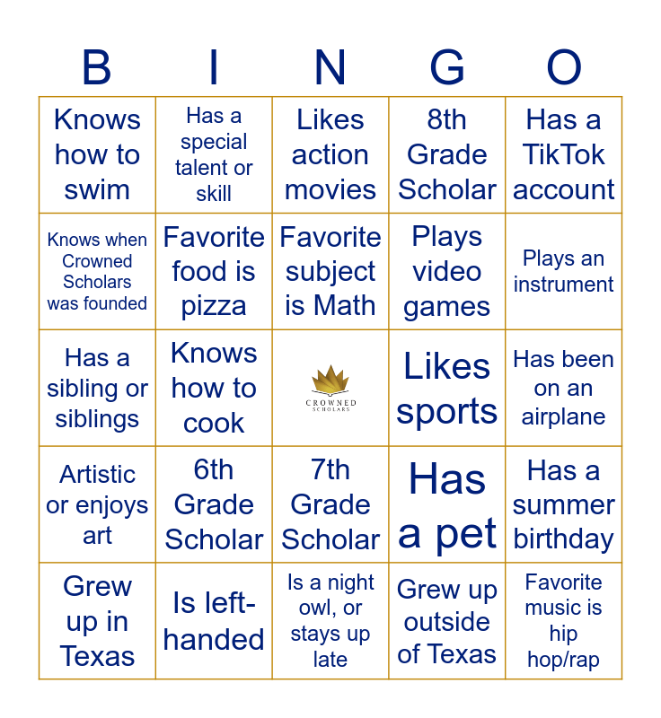 This bingo card has a free space and 24 words: 6th Grade Scholar, Is left-handed, Favorite subject is Math, Grew up in Texas, Has a TikTok account, Knows how to swim, Knows when Crowned Scholars was founded, Has a special talent or skill, Likes sports, 7th Grade Scholar, Plays video games, Has a sibling or siblings, Has a pet, Has a summer birthday, Favorite food is pizza, Grew up outside of Texas, Has been on an airplane, Likes action movies, Plays an instrument, Knows how to cook, Favorite music is hip hop/rap, Artistic or enjoys art, 8th Grade Scholar and Is a night owl, or stays up late.