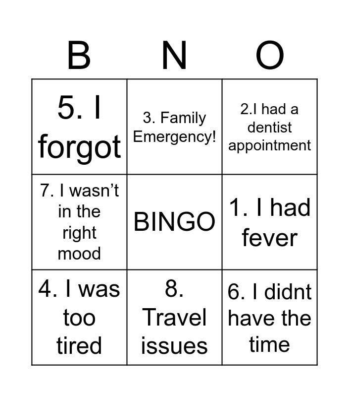 This bingo card has a free space and 8 words: 1. I had fever, 2.I had a dentist appointment, 3. Family Emergency!, 4. I was too tired, 5. I forgot, 6. I didnt have the time, 7. I wasn’t in the right mood and 8. Travel issues.