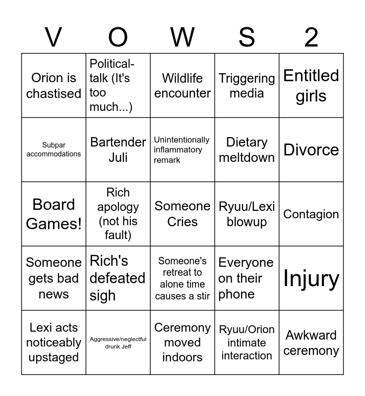 This bingo card has a free space and 24 words: Rich's defeated sigh, Aggressive/neglectful drunk Jeff, Unintentionally inflammatory remark, Lexi acts noticeably upstaged, Entitled girls, Orion is chastised, Subpar accommodations, Political-talk (It's too much...), Ryuu/Lexi blowup, Someone's retreat to alone time causes a stir, Dietary meltdown, Board Games!, Everyone on their phone, Injury, Bartender Juli, Ryuu/Orion intimate interaction, Contagion, Wildlife encounter, Divorce, Rich apology (not his fault), Awkward ceremony, Someone gets bad news, Triggering media and Ceremony moved indoors.