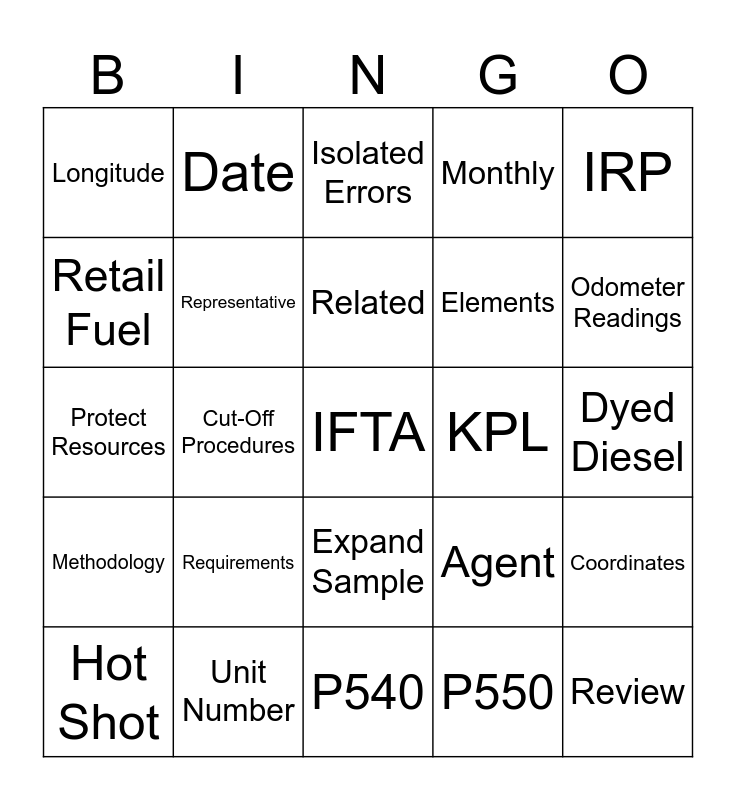 This bingo card has a free space and 149 words: 4 Years, Absolute, Accurate, Adequate, Adjustment, Agent, Allow, Alternative Fuel, Appropriate, Assessment, Assurance, Attributes, Audit, Availability, Balance, Bulk Fuel, Burden of Proof, Capacity, Complete, Compliance, Confidence, Coordinates, Cost Effective, Credible, CSV, Cut-Off Procedures, Date, Destination, Detection, Determination, Diesel, Disallow, Documentation, Dyed Diesel, ECM, Education, Efficiency, ELD, Elements, Equipment, Exceptions, Exemptions, Expand Sample, Farm Plate, Fleet, Fuel Tax Holiday, Fuel Type, Gallons, Gasoline, GPS, Guarantee, Guidelines, Hot Shot, Illegible, Inadequate, Inappropriate, Information, Insufficient, Internal Controls, Inventory, IRP, Isolated Errors, Jeopardy, Judgment, Jurisdiction, Kilometers, KPL, kWh, Latitude, Licensee, Liters, Locations, Long Haul, Longitude, Maintain, Manual Records, Material, Measure, Methodology, Metrics, Miles, Minimize Errors, Monthly, MPG, Non-IFTA Jurisdiction, Obstacles, Odometer Readings, Operation Type, Origin, Orlando, P540, P550, P560, Physical Controls, Policies, Population, Prevention, Procedures, Processes, Projection, Protect Resources, Protection, Qualified Motor Vehicle, Quality, Quantity, Quarterly, Reasonable, Reconciliation, Record Reviews, Recurring Errors, Reduce Testing, Reduction, Related, Reliable, Reporting System, Representative, Requirements, Retail Fuel, Retention, Revenue, Review, Risk, Route, Sample Size, Sampling, Segregation of Duties, Selection, Short Haul, Standard Routes, Statistical, Storage, Substantial, Sufficient, Summary, System Reading, Systematic, Tax Paid Credit, Taxable, Team Driving, Technique, Timely, Total Distance, Unit Cost, Unit Number, Valid, VIN, VTS, Withdrawal and Written Demand.