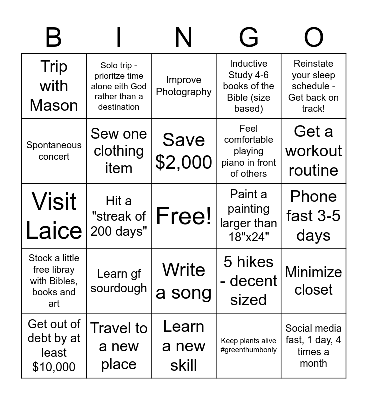 This bingo card has a free space and 24 words: Learn gf sourdough, Travel to a new place, Save $2,000, Get out of debt by at least $10,000, Reinstate your sleep schedule - Get back on track!, Trip with Mason, Spontaneous concert, Solo trip - prioritze time alone eith God rather than a destination, Paint a painting larger than 18"x24", Write a song, Feel comfortable playing piano in front of others, Visit Laice, 5 hikes - decent sized, Minimize closet, Sew one clothing item, Keep plants alive #greenthumbonly, Phone fast 3-5 days, Improve Photography, Get a workout routine, Hit a "streak of 200 days", Social media fast, 1 day, 4 times a month, Stock a little free libray with Bibles, books and art, Inductive Study 4-6 books of the Bible (size based) and Learn a new skill.