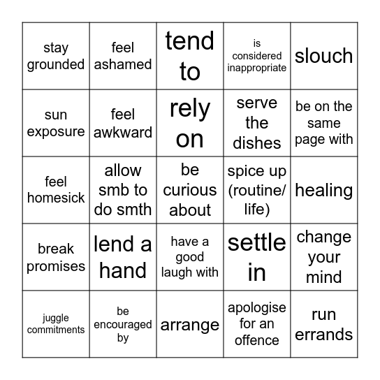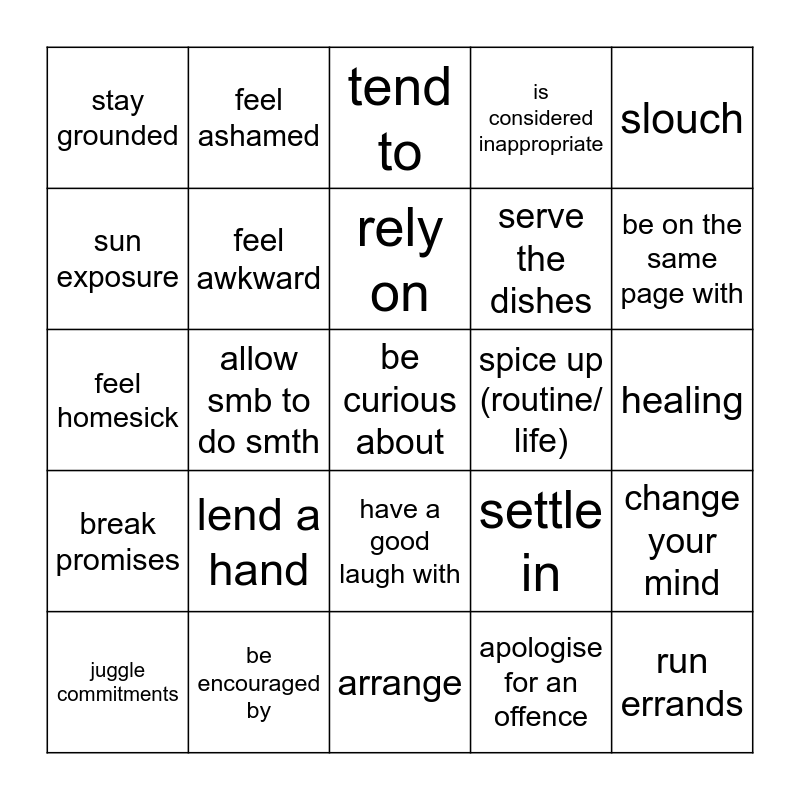 This bingo card has a free space and 24 words: lend a hand, be encouraged by, rely on, juggle commitments, slouch, stay grounded, sun exposure, feel ashamed, spice up (routine/ life), have a good laugh with, serve the dishes, feel homesick, settle in, change your mind, feel awkward, apologise for an offence, healing, tend to, be on the same page with, allow smb to do smth, run errands, break promises, is considered inappropriate and arrange.