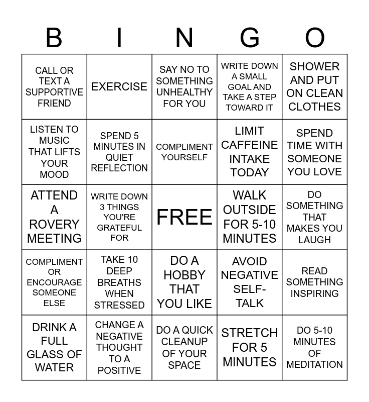This bingo card has a free space and 24 words: DRINK A FULL GLASS OF WATER, TAKE 10 DEEP BREATHS WHEN STRESSED, COMPLIMENT YOURSELF, STRETCH FOR 5 MINUTES, SHOWER AND PUT ON CLEAN CLOTHES, CALL OR TEXT A SUPPORTIVE FRIEND, EXERCISE, SAY NO TO SOMETHING UNHEALTHY FOR YOU, WALK OUTSIDE FOR 5-10 MINUTES, DO SOMETHING THAT MAKES YOU LAUGH, ATTEND A ROVERY MEETING, SPEND 5 MINUTES IN QUIET REFLECTION, AVOID NEGATIVE SELF-TALK, READ SOMETHING INSPIRING, LISTEN TO MUSIC THAT LIFTS YOUR MOOD, CHANGE A NEGATIVE THOUGHT TO A POSITIVE, DO A QUICK CLEANUP OF YOUR SPACE, WRITE DOWN A SMALL GOAL AND TAKE A STEP TOWARD IT, SPEND TIME WITH SOMEONE YOU LOVE, COMPLIMENT OR ENCOURAGE SOMEONE ELSE, WRITE DOWN 3 THINGS YOU'RE GRATEFUL FOR, DO A HOBBY THAT YOU LIKE, LIMIT CAFFEINE INTAKE TODAY and DO 5-10 MINUTES OF MEDITATION.
