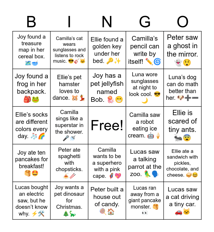 This bingo card has a free space and 33 words: Peter is afraid of the Grim Reaper. ๐ฑโ ๏ธ, Lucas found an electric eel at the beach! โก๐, Camilla sings like a superstar in the shower. ๐ค๐ฟ, Luna wants to ride a dragon to school. ๐๐, Joy ate ten pancakes for breakfast! ๐ฅ๐คฉ, Ellieโs pet hamster loves to dance. ๐น๐, Peter saw a ghost in the mirror. ๐ป๐ฒ, Lucas bought an electric saw, but he doesnโt know why. โก๐ ๏ธ, Camillaโs cat wears sunglasses and listens to rock music. ๐๐ธ๐ฑ, Luna dreams of flying to the moon with a balloon. ๐๐, Joy has a pet jellyfish named Bob. ๐ชผ๐, Ellie found a golden key under her bed. ๐โจ, Peterโs backpack is heavier than an elephant. ๐๐, Lucas tried to juggle watermelons but failed. ๐๐, Camilla saw a robot eating ice cream. ๐ค๐ฆ, Lunaโs dog can do math better than her. ๐ถโโ, Joy wants a pet dinosaur for Christmas. ๐๐ฆ, Ellieโs socks are different colors every day. ๐งฆ๐, Peter ate spaghetti with chopsticks. ๐๐ฅข, Lucas saw a talking parrot at the zoo. ๐ฆ๐ฃ๏ธ, Camilla wants to be a superhero with a pink cape. ๐ฆธโโ๏ธ๐, Lunaโs fish learned how to jump out of the tank. ๐ ๐, Joy found a treasure map in her cereal box. ๐บ๏ธ๐ฅฃ, Ellie is scared of tiny ants. ๐๐จ, Peter built a house out of candy. ๐ญ๐ , Lucas saw a cat driving a tiny car. ๐๐ฑ, Camillaโs pencil can write by itself! โ๏ธ๐, Luna wore sunglasses at night to look cool. ๐๐, Joy found a frog in her backpack. ๐๐ธ, Ellie ate a sandwich with pickles, chocolate, and cheese. ๐ฅช๐, Peterโs robot friend speaks five languages. ๐ค๐ฃ๏ธ, Lucas ran away from a giant pancake monster. ๐ฅ๐ and Camillaโs shadow dances when she plays music. ๐ถ๐บ.