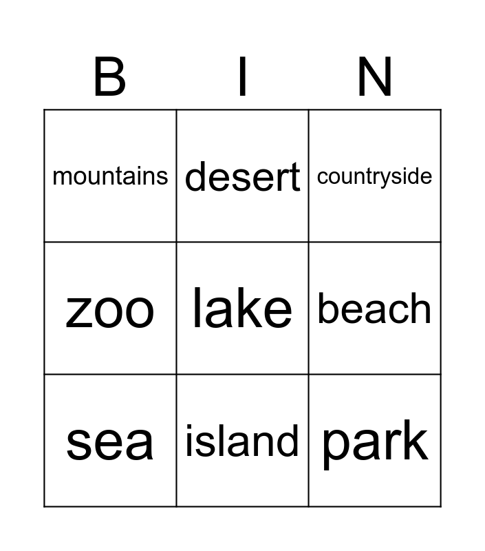 This bingo card has a free space and 8 words: beach, countryside, desert, sea, mountains, park, zoo and island.