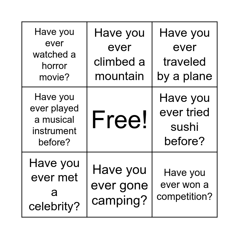 This bingo card has a free space and 8 words: Have you ever tried sushi before?, Have you ever traveled by a plane, Have you ever climbed a mountain, Have you ever met a celebrity?, Have you ever watched a horror movie?, Have you ever won a competition?, Have you ever played a musical instrument before? and Have you ever gone camping?.