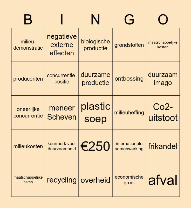 This bingo card has a free space and 34 words: consumenten, economische groei, toenemende mobiliteit, luchtvervuiling, milieukosten, concurrentie-positie, maatschappelijke kosten, maatschappelijke baten, negatieve externe effecten, positieve externe effecten, duurzame productie, biologische productie, maatschappelijk verantwoord ondernemen, milieusubsidie, milieuheffing, duurzaam imago, recycling, oneerlijke concurrentie, keurmerk voor duurzaamheid, internationale samenwerking, €250, €125, milieu- demonstratie, Co2-uitstoot, overheid, afval, grondstoffen, klimaat verandering, ontbossing, producenten, eindproducten, meneer Scheven, frikandel and meneer Arkeraats.