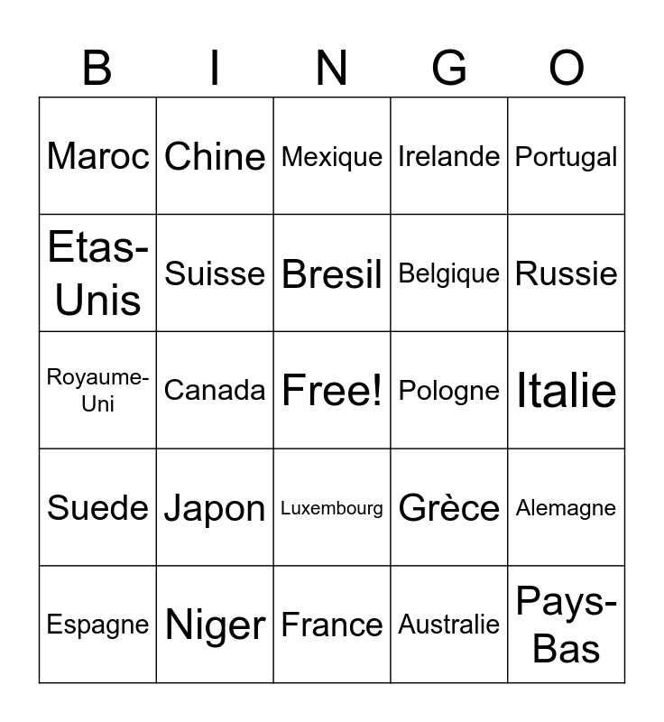 This bingo card has a free space and 27 words: Grèce, Inde, Belgique, France, Etas-Unis, Mexique, Chine, Suede, Pologne, Alemagne, Royaume-Uni, Irelande, Espagne, Niger, Russie, Ukraine, Suisse, Bresil, Japon, Maroc, Italie, Australie, Canada, Pays-Bas, Luxembourg, Portugal and Danemark.