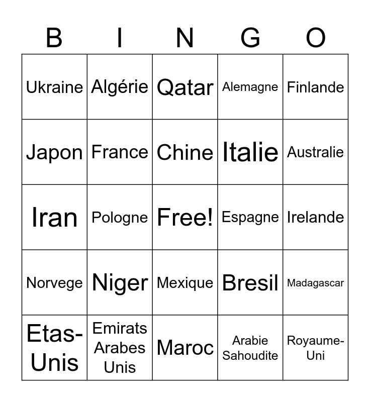 This bingo card has a free space and 39 words: Grèce, Inde, Belgique, France, Etas-Unis, Mexique, Chine, Suede, Finlande, Norvege, Pologne, Alemagne, Royaume-Uni, Irelande, Espagne, Niger, Russie, Ukraine, Suisse, Bresil, Japon, Maroc, Italie, Australie, Canada, Pays-Bas, Luxembourg, Portugal, Danemark, Algérie, Turquie, Roumanie, Qatar, Emirats Arabes Unis, Arabie Sahoudite, R.D. Congo, Madagascar, Iran and Irak.