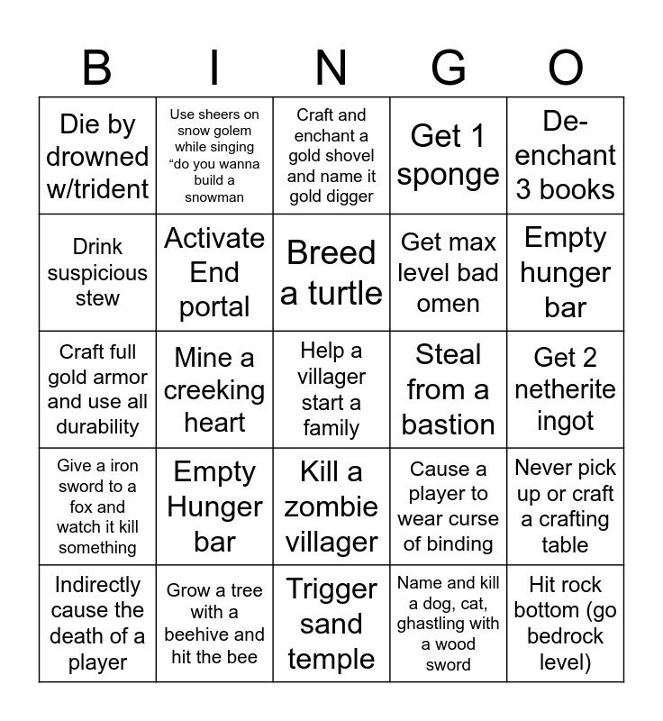 This bingo card has a free space and 24 words: Indirectly cause the death of a player, Empty Hunger bar, Breed a turtle, Name and kill a dog, cat, ghastling with a wood sword, De-enchant 3 books, Die by drowned w/trident, Use sheers on snow golem while singing “do you wanna build a snowman, Craft and enchant a gold shovel and name it gold digger, Steal from a bastion, Get 2 netherite ingot, Craft full gold armor and use all durability, Activate End portal, Cause a player to wear curse of binding, Never pick up or craft a crafting table, Drink suspicious stew, Grow a tree with a beehive and hit the bee, Trigger sand temple, Get 1 sponge, Empty hunger bar, Give a iron sword to a fox and watch it kill something, Mine a creeking heart, Kill a zombie villager, Get max level bad omen and Hit rock bottom (go bedrock level).