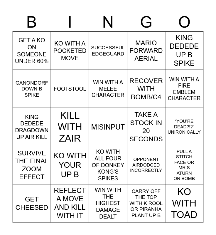 This bingo card has a free space and 184 words: SURVIVE TO 200%, WIN WITH A 60% HANDICAP, THREE STOCK, WIN WITH RANDOM, HIT A TAUNT AND DO DAMAGE, WIN WITH YOUR WORST CHARACTER, COUNTER KO, LAND RIDLEY DOWN B, WIN A GAME AFTER SD'ING YOUR FIRST STOCK, SHIELD BREAK, FALCON PUNCH!, WIN WITHOUT SHIELDING, KO WITH A LITTLE MAC AERIAL, YOUR OPPONENT SD'D UNDER 30 PERCENT, GET A KO ON SOMEONE UNDER 60%, KO WITH A THROW, ZERO TO DEATH, LAND A GAME & WATCH 9, GET 3 SPIKES TOTAL, WIN WITH YOUR MAIN, KO WITH JAB, WIN WITHOUT THE B BUTTON, SNIPE SOMEONE OFFSTAGE, LAND A FULLY CHARGED SMASH ATTACK, GET CHEESED, KO USING ONLY ONE MOVE, KO WITH KO PUNCH, KO WITH REST, FOOTSTOOL, WIN WITH A MAIN ANTAGONIST, CHEESE SOMEONE, WIN WITHOUT JUMPING, GET YOUR MAIN ON RANDOM, KO WITH MARIO CAPE OFFSTAGE, KO WITH KIRBY COPY ABILITY, WIN WITH SOMEONE YOU RARELY/NEVER PICK, FIRST BLOOD, WIN WITH SOMEONE ELSE'S MAIN YOU DONT SHARE, OPPONENT GOT STAGE SPIKED, WIN WITH A BOTTOM TIER, DO 10 TAUNTS IN ONE GAME, PARRY 5 TIMES IN ONE GAME, HARD READ, BURY THE OPPONENT, KO WITH JIGGLYPUFF ROLLOUT, KO WITH A POCKETED MOVE, 2 FRAME, LAND 3 COUNTERS IN ONE GAME, GET TO 69 OR 115%, WIN WITH A MARIO CHARACTER, KO WITH YOUR UP B, KO WITH MARIO FLUDD, TAKE A STOCK IN 20 SECONDS, PULL A STITCH FACE OR MR SATURN OR BOMB, WIN WITH A MAIN PROTAGONIST, SUICIDE KILL, KO WITH FINISHING TOUCH, DOUBLE DIP, DRAGDOWN KILL CONFIRM, PLAY A PROJECTILE CHARACTER AND WIN WITHOUT USING PROJECTILES, WIN A GAME IN THREE MINUTES, WIN WITHOUT USING A SMASH ATTACK, RECOVER WITH BOMB/C4, WIN WITH A FIRE EMBLEM CHARACTER, WIN WITH A POKEMON CHARACTER, COMPLAIN, WIN WITH SHULK WITHOUT USING A MONADO ART, NESS UP B ROCKET, KO WITH WARLOCK PUNCH, WIN WITH A LEGEND OF ZELDA CHARACTER, KO WITH WAFT, WIN USING PYTHRA REVERSE ROLES, MARIO FORWARD AERIAL, WIN WITH A MII, BE HYPE, DISRESPECT, KO WITH TREE, WIN 3 GAMES IN A ROW, KO WITH LUIGI UP B, GET A CANON MATCHUP ON RANDOM, REFLECT A MOVE AND KILL WITH IT, GET A KO WITH SOPO, GET A KO WITH SOLOMAR, BIG STUPID MOVE, SURVIVE A KILL SPARK, HIT GANON SIDE B 3 TIMES IN A ROW, KO WITH FIRE HYDRANT, OPPONENT AIRDODGED INCORRECTLY, WIN WITH A STAR KO, WIN WITH A DLC CHARACTER, GET A SPLAT KO, WIN WITH BLUE KIRBY, KO WITH EGG ROLL, HOPCAT VICTORY, WOLF FLASH SPIKE, SHINE “SPIKE”, KO WITH ALL FOUR OF DONKEY KONG’S SPIKES, LUIGI MISFIRE KO, PUMMEL SEVEN TIMES WITH ONE GRAB, HIT EVERY MOVE IN A SINGLE GAME, LAG, MIRROR MATCH ON RANDOM, SAVE SOMEONE FROM A TRAGIC SD, “YOU’RE DEAD?!?” UNIRONICALLY, KILL WITH GAME AND WATCH BUCKET, BITE SOMEONE AT 87%, JOHNS, WII FIT TRAINER FAIR SPIKE, MAKE SOMEONE TRIP, GET YOUR SMASH WAIFU/HUSBANDO ON RANDOM, ELECTRIC KO, SUCCESSFUL EDGEGUARD, KO WITH FTILT, WIN WITH A HEAVY, WIN WITH A LIGHTWEIGHT, GET CUTSCENED, PERFORM A CUTSCENE, FALCO SIDE B SPIKE, WIN WITHOUT USING A SINGLE AERIAL, WIN WITH AN ECHO FIGHTER, WIN WITH A SMASH 64 CHARACTER, WIN WITH A MELEE CHARACTER, WIN WITH A BRAWL CHARACTER, WIN WITH AN ULTIMATE CHARACTER, WIN WITH A SMASH 4 CHARACTER, LAME FINISH, GET TO 150% AS PICHU, CARRY OFF THE TOP WITH K ROOL OR PIRANHA PLANT UP B, WIN WITHOUT THE A BUTTON, KIRBY/ KING DEDEDE HAMMER KILL, UP THROW THUNDER COMBO, MONKEY FLIP SPIKE, BOWSER DOWN B SPIKE, KING DEDEDE UP B SPIKE, GANONDORF DOWN B SPIKE, LEDGE TO LEDGE UNTOUCHED, WIN WITH A HYPE CHARACTER, WIN WITH A LAME CHARACTER, MAKE OTHER PLAYER HAVE NO FUN, MOVE KILLED EARLY FOR NO REASON, GET 5 LEDGETRAPS IN A ROW, OPPONENT MADE A ZOMBIES REFERENCE INCIDENTALLY, EWGF COMBO, POWER GEYSER OR BUSTER WOLF KILL, HEAL OVER 20 HEALTH IN A MATCH, KILL WITH ZAIR, WIN BY TIMEOUT, TAKE A STOCK ONLY USING HERO DOWN B, PIT DOWN AIR SPIKE, WIN WITH YOUR FAVORITE CHARACTER, WIN WITH YOUR LEAST FAVORITE CHARACTER, WIN WITH A FIGHTING GAME CHARACTER, WIN WITH A THIRD PARTY CHARACTER, WIN WITH A NINTENDO CHARACTER, KING DEDEDE DRAGDOWN UP AIR KILL, DONKEY KONG GIANT PUNCH KILL, TECH A STAGE SPIKE, KNEE KILL, GET STAR KO'D, TNT KILL, TEAM COMBO, WIN WITH THE HIGHEST DAMAGE DEALT, WIN WITH THE LOWEST DAMAGE TAKEN, CHARACTER ITEM KILL, PROJECTILE KILL, KO WITH A CHROY OR MARCINA BACK THROW (DAIR FINISHER COUNTS), TIMBS KILL, JAB RESET, FOX INFINITE REP, SURVIVE THE FINAL ZOOM EFFECT, CROWD CHEERS FOR YOU, WIN WITH BOTH ROYS, KO WITH GANON UP TILT, KILL WITH STEVE FISTS, SUCK N CUCK, FOOTSTOOL, WIN WITHOUT THE MONADOS, THWACK OR WHACK KILL, KO WITH TOAD, KILL WITH A NON-HUMAN CHARACTER, MASH OUT OF A BURY, ROLL GETUP SIDE B KILL WITH DARK PIT, BELL COMBO and KO WITH BACK SLASH.