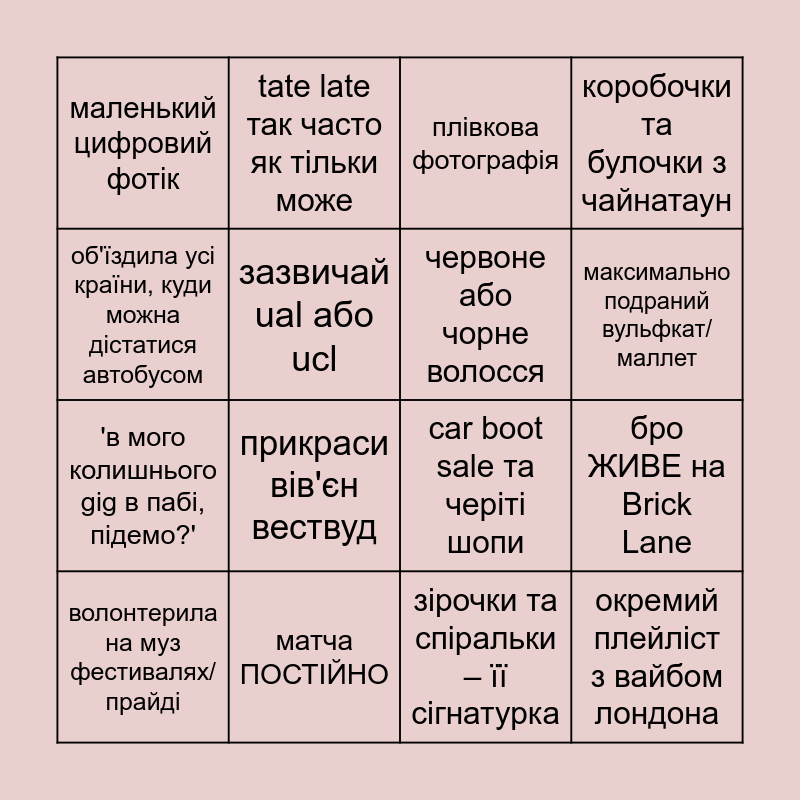 This bingo card has 16 words: матча ПОСТІЙНО, бро ЖИВЕ на Brick Lane, плівкова фотографія, маленький цифровий фотік, 'в мого колишнього gig в пабі, підемо?', tate late так часто як тільки може, car boot sale та черіті шопи, зірочки та спіральки – її сігнатурка, об'їздила усі країни, куди можна дістатися автобусом, зазвичай ual або ucl, волонтерила на муз фестивалях/прайді, коробочки та булочки з чайнатаун, прикраси вів'єн вествуд, максимально подраний вульфкат/маллет, червоне або чорне волосся and окремий плейліст з вайбом лондона.