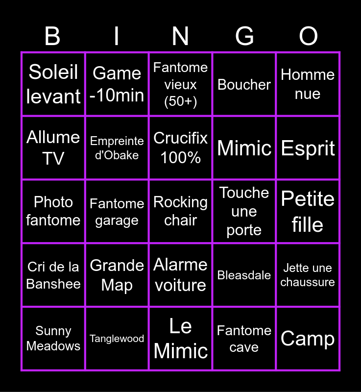 This bingo card has 195 words: Banshee, Cauchemar, Démon, Deogen, Djinn, Esprit, Fantôme, Goryo, Hantu, Mimic, Jumeaux, Moroï, Myling, Obake, Ombre, Oni, Onryo, Poltergeist, Raiju, Revenant, Spectre, Thayé, Yokai, Yurei, Tanglewood, Redgeview, Willow, Edgefield, Bleasdale, Grafton, Camp, Sunny Meadows, Ecole, Prison, Boite à musique, Miroir, Tarot, Carte The Hanged Man, Carte The High Priestess, Ouija, Cercle d'invocation, Poupée vaudou, Patte de singe, Mist, Brouillard, Neige, Soleil levant, Sadako, Petite fille, Homme nue, Boucher, Photo fantome, Photo DOTS, Eau sale, Douche, Guitare, Piano, Rocking chair, Ventilateur, Allume TV, Telephone qui vibre/sonne, Alarme voiture, Lumière rouge, Explose lumière, Fantome chante, Fantome cave, Fantome grenier, Fantome garage, Game parfaite, Game sans preuve, Game fantome 150%, Game sans lumière, Game -10min, Colonne vertébrale, Crane, Cage thoracique, Cri de la Banshee, Cri du Deogen, Fantome vieux (50+), Fantome jeune (50-), Empreinte fenêtre, Empreinte interrupteur, Survivre sans se cacher, Fantome attaque au dessus de 70%, Crucifix 100%, Banshee, Cauchemar, Démon, Deogen, Djinn, Esprit, Fantôme, Goryo, Hantu, Le Mimic, Les Jumeaux, Moroï, Myling, Obake, Ombre, Oni, Onryo, Poltergeist, Raiju, Revenant, Spectre, Thayé, Yokai, Yurei, Tanglewood, Redgeview, Willow, Edgefield, Bleasdale, Grafton, Camp, Sunny Meadows, Ecole, Prison, Boite à musique, Miroir, Tarot, Carte The Hanged Man, Carte The High Priestess, Ouija, Cercle d'invocation, Poupée baudou, Patte de singe, Réanimer sans mourir, Brouillard, Neige, Soleil levant, Sadako, Petite fille, Homme nu, Boucher, Photo fantome, Photo DOTS, Eau sale, Douche, Guitare, Piano, Rocking chair, Ventilateur, Allume TV, Telephone qui vibre/sonne, Alarme voiture, Lumière rouge, Explose lumière, Fantome chante, Fantome cave, Fantome grenier, Fantome garage, Game parfaite, Game sans preuve, Game fantome 150%, Game sans lumière, Game -10min, Colonne vertébrale, Crane, Cage thoracique, Cri de la Banshee, Cri du Deogen, Fantome vieux (50+), Fantome jeune (50-), Empreinte fenêtre, Empreinte interrupteur, Survivre sans se cacher, Fantome attaque au dessus de 70%, Crucifix 100%, Tourne sa tete, Ecriture, Fait tomber un cadre, Jette une chaussure, Jette une assiette, Jette un couvert, Coupe le courant, Orbe fantomatique, Souffle une bougie, Entité joue du piano, Allume une lampe, Allume la radio, Blood Moon, Sylroc meurt, Sylroc dit "put***", Sylroc sursaute, Empreinte d'Obake, Grande Map, Petite Map, Map Moyenne, Sylroc oublie son briquet, L'entité crame un cruci, Photo ratée, Touche une porte and Touche une porte.