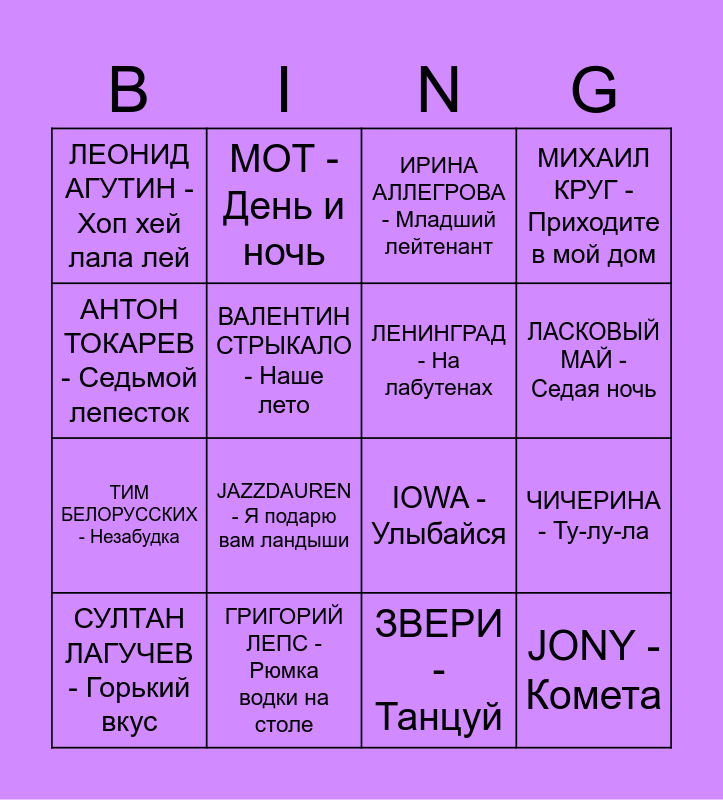 This bingo card has 96 words: СЕРЕБРО - Между нами любовь, ANNA ASTI - Царица, ЛЮСЯ ЧЕБОТИНА - Солнце Монако, ГРИГОРИЙ ЛЕПС - Рюмка водки на столе, ВАЛЕРИЙ МЕЛАДЗЕ - Красиво, ЖЕНЯ ТРОФИМОВ - Поезда, АРТУР ПИРОЖКОВ - Зацепила меня, АНДРЕЙ ГУБИН - Ночь, ИНСТАСАМКА - За деньги да, BLIZKEY - Горы, ХАБИБ - Ягода-малинка, 2 МАШИ - Мама, я танцую, DABRO - Юность, JAZZDAUREN - Я подарю вам ландыши, ARTIK & ASTI - Грустный дэнс, ВАЛЕНТИН СТРЫКАЛО - Наше лето, ЛАСКОВЫЙ МАЙ - Седая ночь, МАКСИМ - Знаешь ли ты, СЕРГЕЙ ЛАЗАРЕВ - В самое сердце, СТАС МИХАЙЛОВ - Всё для тебя, РУКИ ВВЕРХ - Крошка моя, ТАТЬЯНА КУРТУКОВА - Матушка Земля, ТАТЬЯНА БУЛАНОВА - Мой ненаглядный, ЗВЕРИ - Районы-кварталы, ЛЕПРИКОНСЫ - Хали-гали, ANNA ASTI - По барам, МУРАТ НАСЫРОВ - Я это ты, ЛЕОНИД АГУТИН - Хоп хей лала лей, GALIBRI & MAVIK - Федерико Феллини, ЮРИЙ АНТОНОВ - Летящей походкой, ЖУКИ - Батарейка, РУКИ ВВЕРХ - 18 мне уже, ИВАНУШКИ - Тополиный пух, КАТЯ ЛЕЛЬ - Мой мармеладный, АНТОН ТОКАРЕВ - Седьмой лепесток, ЗЕМЛЯНЕ - Трава у дома, МИРАЖ - Наступает ночь, ВАЛЕРИЙ МЕЛАДЗЕ - Салют, Вера, GAYAZOVS BROTHERS - Малиновая Лада, ЧИЧЕРИНА - Ту-лу-ла, ЕГОР КРИД - Самая-самая, МИХАИЛ ШАФУТИНСКИЙ - Марджанджа, СУЛТАН ЛАГУЧЕВ - Горький вкус, АНДРЕЙ ГУБИН - Зима-холода, JONY - Комета, ИРИНА АЛЛЕГРОВА - Младший лейтенант, ЮРИЙ ШАТУНОВ - Детство, ШАМАН - Я русский, ZDOB SI ZDUB - Видели ночь, CREAM SODA - Никаких больше вечеринок, СЕКТОР ГАЗА - 30 лет, СПЛИН - Моё сердце, ЮРИЙ ШАТУНОВ - Белые розы, ЛЕНИНГРАД - WWW, ОТПЕТЫЕ МОШЕННИКИ - Девушки бывают разные, МУРАТ ТХАГАЛЕГОВ - На дискотеку, JAH KHALIB - Если чё, я Баха, ДИМА БИЛАН - Молния, SLAVA MARLOW - Снова я напиваюсь, ARTIK & ASTI - Девочка, танцуй, ЛЮСЯ ЧЕБОТИНА - Плакал Голливуд, RASA - Пчеловод, КОРОЛЬ И ШУТ - Прыгну со скалы, ДИМА БИЛАН - Невозможное возможно, КРАСКИ - Старший брат, АКУЛА - Кислотный диджей, ВИРУС - Ручки, ДЕМО - Солнышко, ТАТУ - Я сошла с ума, ПРОПАГАНДА - Мелом, ВИРУС - Ты меня не ищи, МИНАЕВА - Шоколадка, 2 МАШИ - Босая, АЛЕКСАНДР СЕРОВ - Я люблю тебя до слёз, ЖАННА ФРИСКЕ - Ла-ла-ла, СУПЕР ЖОРИК - Золото, МИТЯ ФОМИН - Всё будет хорошо, ЛЕНИНГРАД - На лабутенах, ЛЯПИС ТРУБЕЦКОЙ - Ау, ТИМ БЕЛОРУССКИХ - Незабудка, МИХАИЛ КРУГ - Приходите в мой дом, БРАВО - Московский бит, ЛЮБОВЬ УСПЕНСКАЯ - Кабриолет, MR. CREDO - Медляк, НАТАЛИ - Ветер с моря дул, IOWA - Улыбайся, ZIVERT - Beverly Hills, НЕПАРА - Другая причина, ГРАДУСЫ - Голая, ЗВЕРИ - Танцуй, ОЛЬГА БУЗОВА - Мало половин, БАНДЭРОС - Про красивую жизнь, NILETTO - Любимка, КЛАВА КОКА - Покинула чат, МОТ - День и ночь and КИПЕЛОВ - Я свободен.