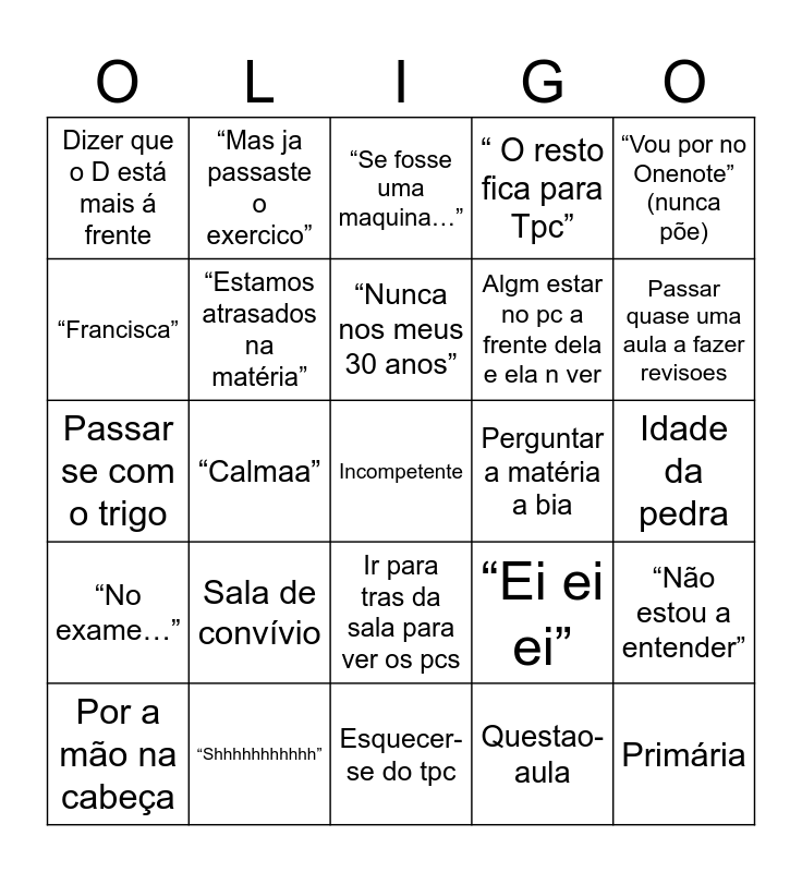 This bingo card has a free space and 24 words: Sala de convívio, “Shhhhhhhhhhh”, “Nunca nos meus 30 anos”, Por a mão na cabeça, “Vou por no Onenote” (nunca põe), Dizer que o D está mais á frente, “Francisca”, “Mas ja passaste o exercico”, Perguntar a matéria a bia, Ir para tras da sala para ver os pcs, Algm estar no pc a frente dela e ela n ver, Passar se com o trigo, “Ei ei ei”, “Não estou a entender”, “Estamos atrasados na matéria”, Questao-aula, Idade da pedra, “Se fosse uma maquina…”, Passar quase uma aula a fazer revisoes, “Calmaa”, Primária, “No exame…”, “ O resto fica para Tpc” and Esquecer-se do tpc.