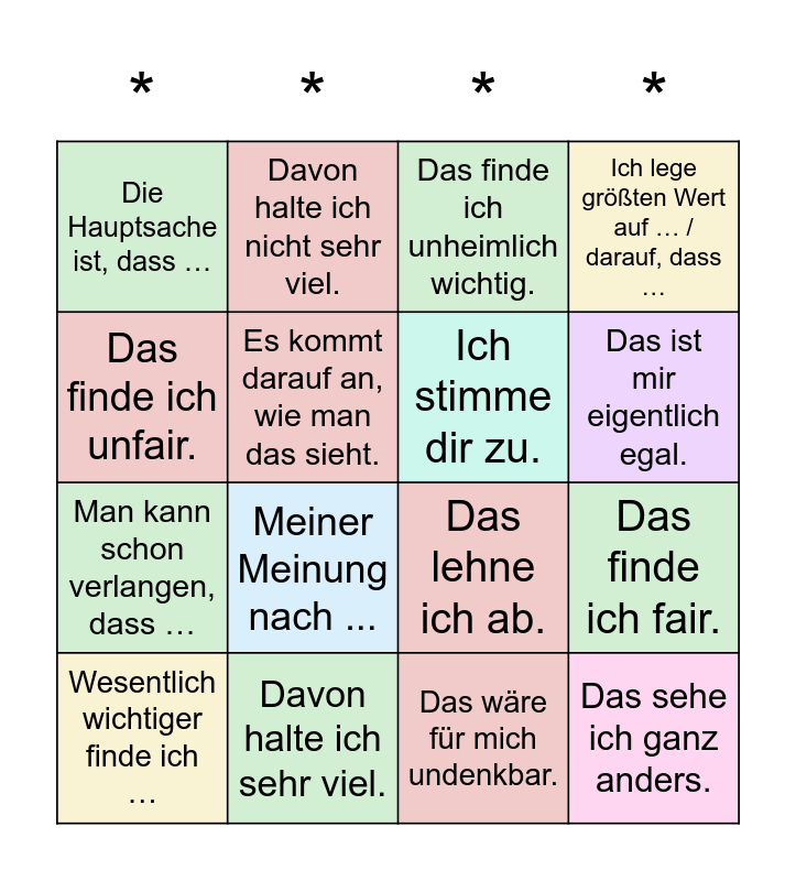 This bingo card has 16 words: Davon halte ich sehr viel., Das finde ich fair., Das finde ich unheimlich wichtig., Die Hauptsache ist, dass …, Man kann schon verlangen, dass …, Davon halte ich nicht sehr viel., Das lehne ich ab., Das wäre für mich undenkbar., Das finde ich unfair., Es kommt darauf an, wie man das sieht., Wesentlich wichtiger finde ich …, Ich lege größten Wert auf … / darauf, dass …, Meiner Meinung nach ..., Das ist mir eigentlich egal., Ich stimme dir zu. and Das sehe ich ganz anders..