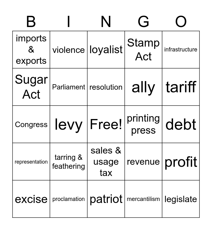 This bingo card has a free space and 31 words: patriot, goods & services, levy, liberty, imports & exports, loyalist, Parliament, revenue, printing press, mercantilism, debt, legislate, declaration, cash crops, tariff, quarter, profit, tarring & feathering, representation, sales & usage tax, infrastructure, impose, excise, violence, ally, Sugar Act, Stamp Act, Congress, proclamation, resolution and natural rights.