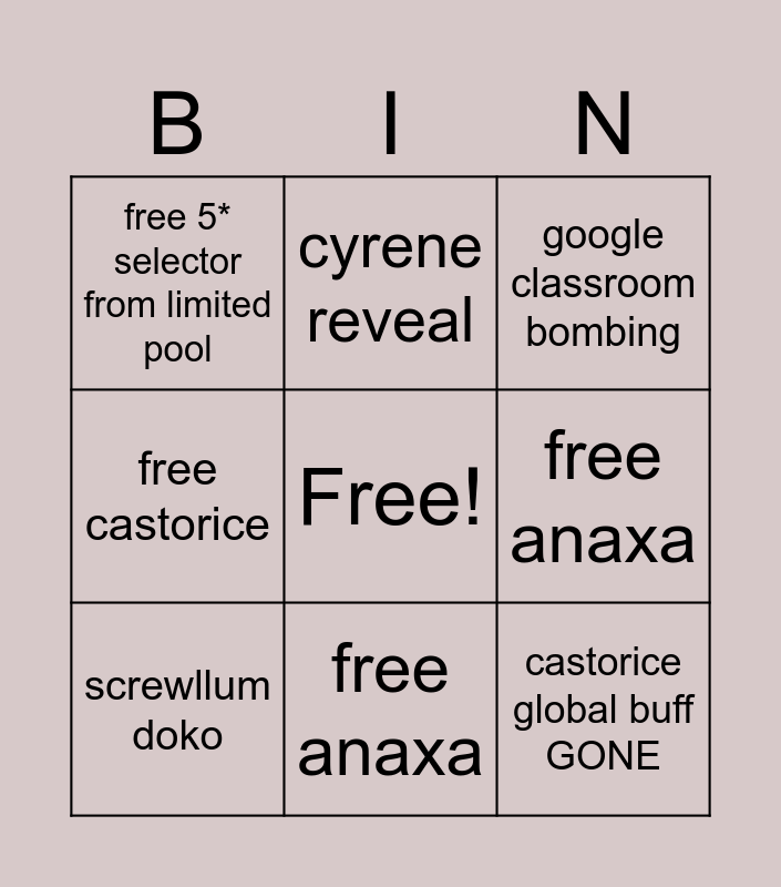This bingo card has a free space and 9 words: screwllum doko, google classroom bombing, cyrene reveal, free castorice, free 5* selector from limited pool, free anaxa, castorice global buff GONE, 1.X characters BUFF reveal and free anaxa.