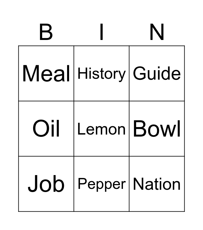 This bingo card has a free space and 8 words: Bowl, Guide, History, Job, Meal, Nation, Oil and Pepper.