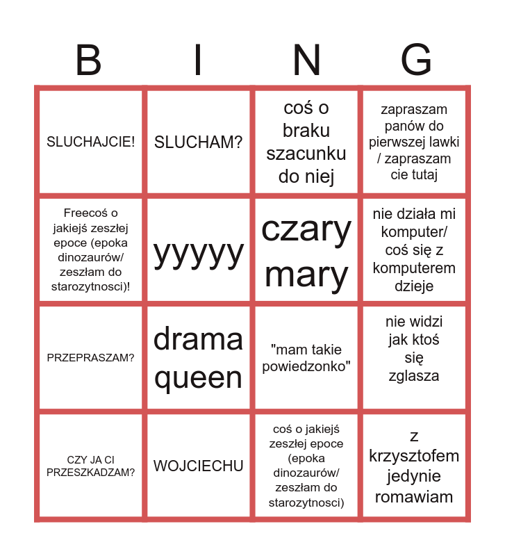 This bingo card has 16 words: WOJCIECHU, nie widzi jak ktoś się zglasza, coś o braku szacunku do niej, SLUCHAJCIE!, PRZEPRASZAM?, SLUCHAM?, "mam takie powiedzonko", coś o jakiejś zeszłej epoce (epoka dinozaurów/ zeszłam do starozytnosci), Freecoś o jakiejś zeszłej epoce (epoka dinozaurów/ zeszłam do starozytnosci)!, yyyyy, CZY JA CI PRZESZKADZAM?, zapraszam panów do pierwszej lawki / zapraszam cie tutaj, drama queen, nie działa mi komputer/ coś się z komputerem dzieje, czary mary and z krzysztofem jedynie romawiam.