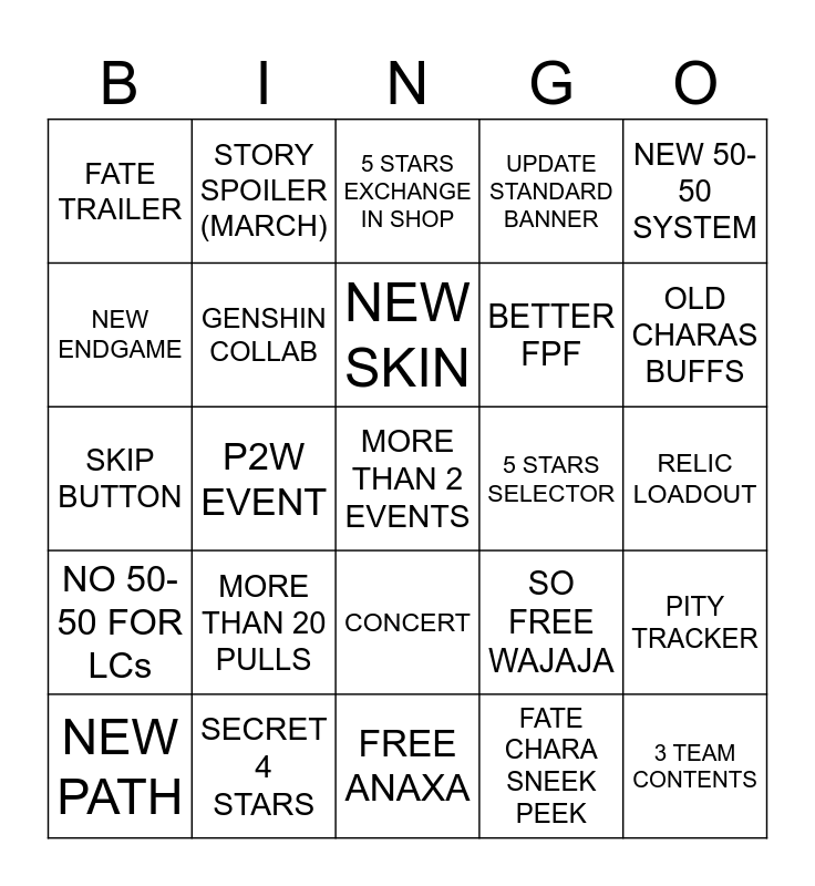 This bingo card has 25 words: MORE THAN 20 PULLS, FREE ANAXA, NEW SKIN, NEW PATH, NEW 50-50 SYSTEM, FATE TRAILER, NEW ENDGAME, STORY SPOILER (MARCH), 5 STARS SELECTOR, CONCERT, BETTER FPF, SKIP BUTTON, SO FREE WAJAJA, PITY TRACKER, GENSHIN COLLAB, 3 TEAM CONTENTS, RELIC LOADOUT, 5 STARS EXCHANGE IN SHOP, OLD CHARAS BUFFS, P2W EVENT, MORE THAN 2 EVENTS, SECRET 4 STARS, NO 50-50 FOR LCs, UPDATE STANDARD BANNER and FATE CHARA SNEEK PEEK.