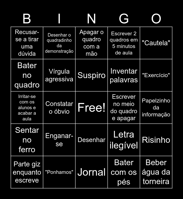 This bingo card has a free space and 43 words: Caminhar pelo estrado à frente do quadro, Beber água da torneira, Calças cheias de giz, Parte giz enquanto escreve, Piadola, Bater com os pés, Apagar o quadro com a mão, "Ficamos por aqui", "Cautela", "Ponhamos", Escrever 2 quadros em 5 minutos de aula, Escrever no meio do quadro e apagar, Desenhar, Enganar-se, Perder-se no raciocínio, Jornal, Mandar alunos calar, Irritar-se com os alunos e acabar a aula, ???, "Exercício", Desenhar o quadradinho da demonstração, "Vou poupar nos pormenores", "É igual ao que foi visto em R", Recusar-se a tirar uma dúvida, Gaguejar, Papelzinho da informação, Pernas abertas, Ênfase em palavras aleatórias, Letra ilegível, Sentar no ferro, Antigo acordo ortográfico, Risinho, Redundância, Constatar o óbvio, Mão no bolso, "Enfim", Desenhar o quadradão da demonstração, Suspiro, Bater no quadro, Inventar palavras, Estalar as mãos, Vírgula agressiva and "Bom".