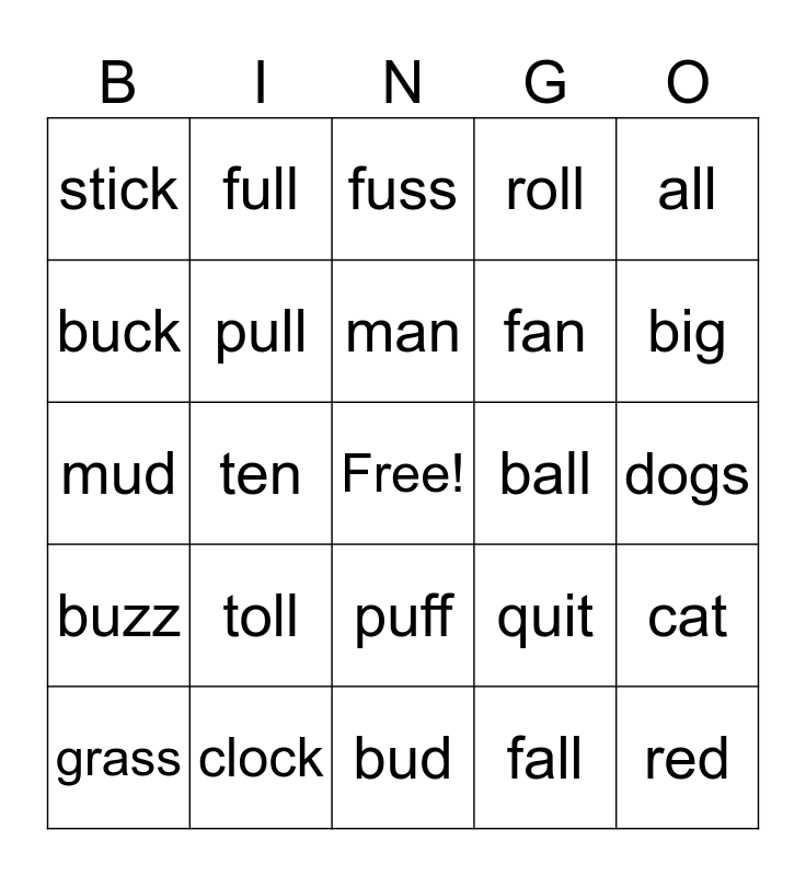This bingo card has a free space and 29 words: grass, mad, ten, pack, stick, fuss, pull, toll, ball, clock, dogs, red, bud, fall, big, miss, puff, buzz, all, mud, quit, yam, fan, buck, roll, full, cat, man and ram.