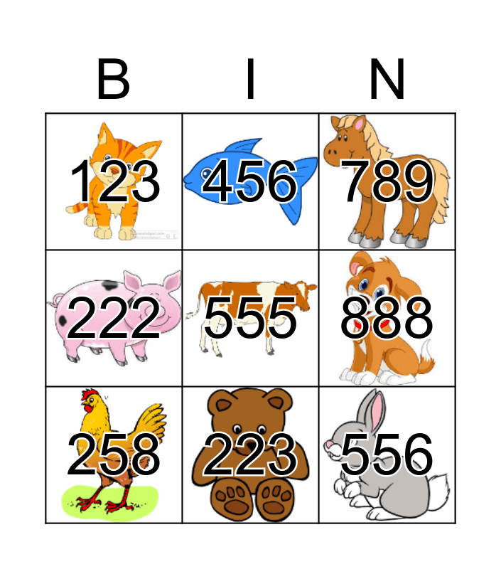 This bingo card has 9 images and 9 words: 258, 789, 456, 222, 123, 888, 555, 556 and 223.