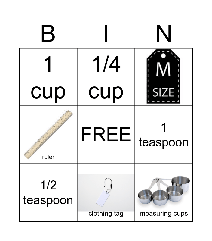 This bingo card has 12 images, a free space and 15 words: measuring cups, measuring spoons, 1 cup, 1/2 cup, 1/4 cup, 1/3 cup, 1 tablespoon, 1 teaspoon, 1/2 tablespoon, 1/2 teaspoon, liquid measuring cup, clothing tag, ruler, clock and timer.