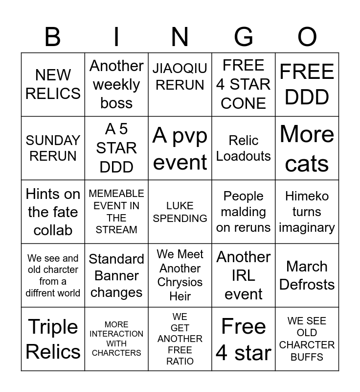 This bingo card has a free space and 24 words: Standard Banner changes, MORE INTERACTION WITH CHARCTERS, A pvp event, Triple Relics, FREE DDD, NEW RELICS, SUNDAY RERUN, Another weekly boss, People malding on reruns, We Meet Another Chrysios Heir, Relic Loadouts, Hints on the fate collab, Another IRL event, March Defrosts, A 5 STAR DDD, Free 4 star, Himeko turns imaginary, JIAOQIU RERUN, More cats, MEMEABLE EVENT IN THE STREAM, WE SEE OLD CHARCTER BUFFS, We see and old charcter from a diffrent world, FREE 4 STAR CONE and WE GET ANOTHER FREE RATIO.
