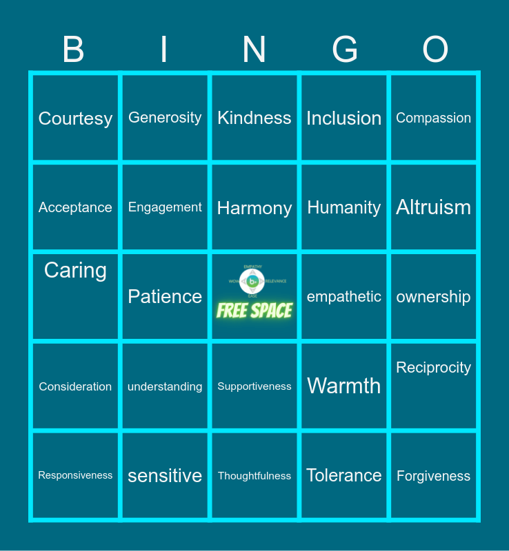 This bingo card has a free space and 29 words: Responsiveness, Respect, Patience, Active Listening, Courtesy, Kindness, Engagement, understanding, empathetic, sensitive, ownership, Forgiveness, Thoughtfulness, Tolerance, Altruism, Sympathy, Supportiveness, Consideration, Compassion, Caring, Warmth, Affection, Humanity, Acceptance, Inclusion, Generosity, Reciprocity, Harmony and Unity.
