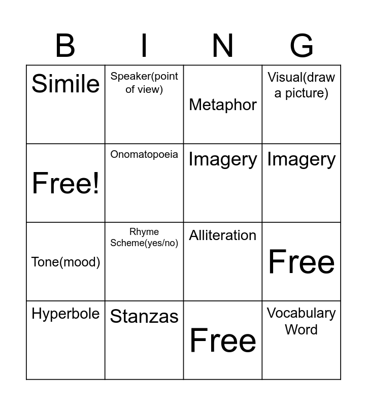 This bingo card has 16 words: Stanzas, Free, Metaphor, Simile, Tone(mood), Speaker(point of view), Alliteration, Free, Free!, Onomatopoeia, Hyperbole, Visual(draw a picture), Rhyme Scheme(yes/no), Imagery, Imagery and Vocabulary Word.