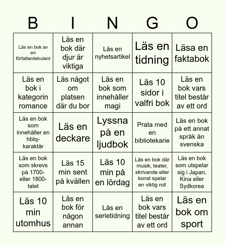 This bingo card has 44 words: Free!, Lyssna på en ljudbok, Läs en bok som har max 30 sidor, Läs 10 min utomhus, Läs en bok skriven av en författare som bor i Sverige, Läs en bok vars titel består av ett ord, Läs en nyhetsartikel, Låna minst 3 böcker på biblioteket, Läsa en faktabok, Läs en bok för någon annan, Läs en tidning, Prata med en bibliotekarie, Läs 10 min på en lördag, Läs 15 min sent på kvällen, Läs en bok skriven av en författare med efternamn som börjar på L, Läs en serietidning, Läs en bok med grönt omslag, Läs en bok som innehåller en hbtq-karaktär, Läs en dikt, Läs en bok vars titel består av ett ord, Läs en bok där djur är viktiga, Läs en bok som blivit film, Läs en klassiker, Läs en bok av en författardebutant, Läs en bok som är skriven av en författare från Afrika, Läs en bok på ett annat språk än svenska, Läs en bok som utspelar sig i flera tider, Läs en novell, Läs en bok där musik, teater, skrivande eller konst spelar en viktig roll, Läs en bok som skrevs på 1700- eller 1800-talet, Läs en bok med två personer på omslaget, Läs en bok som utspelar sig i Japan, Kina eller Sydkorea, Läs en bok som tilldelats ett pris, Läs en bok med en ung huvudperson, Läs en deckare, Läs en bok som utspelar sig i skolmiljö, Läs en rolig bok, Läs en bok om sport, Läs en bok som innehåller magi, Läs en bok i kategorin romance, Läs 10 sidor i valfri bok, Läs om en hjälte eller förebild, Läs något om platsen där du bor and Läs något om naturen.