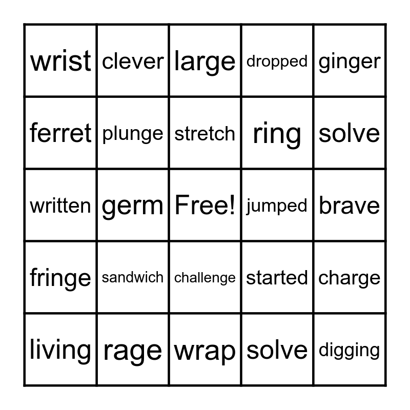 This bingo card has a free space and 34 words: digit, solve, twelve, carve, fringe, plunge, ginger, living, clever, catch, stretch, large, rubbed, itching, jumped, solve, rage, written, sandwich, started, challenge, harvest, wrist, brave, wrap, digging, dropped, match, ring, ferret, merge, germ, charge and spotted.