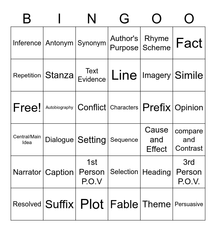 This bingo card has 36 words: Selection, 1st Person P.O.V, Fable, Repetition, Central/Main Idea, Characters, Stanza, Plot, Rhyme Scheme, Heading, Simile, Author's Purpose, 3rd Person P.O.V., Autobiography, Line, Inference, Narrator, Prefix, Free!, Synonym, Conflict, Dialogue, Sequence, Setting, Cause and Effect, Antonym, Imagery, Suffix, Text Evidence, Fact, Persuasive, Resolved, compare and Contrast, Opinion, Caption and Theme.