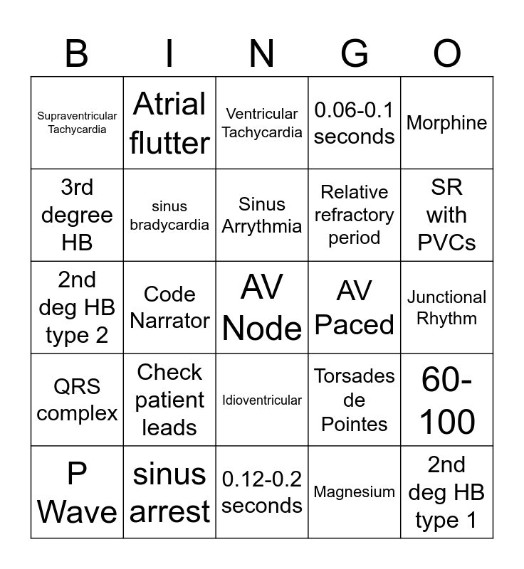 This bingo card has 42 words: Ventricular Fibrillation, Sinus Arrythmia, Premature Atrial Contractions, Check patient leads, Magnesium, 60-100, AV Node, Code Blue, Ventricular Tachycardia, Idioventricular, Junctional Rhythm, SR with PVCs, Code Narrator, Morphine, Defibrillator, Torsades de Pointes, Call 12345, 2nd deg HB type 2, Start Compressions, Atrial flutter, 3rd degree HB, 1st degree HB, 2nd deg HB type 1, Supraventricular Tachycardia, Accelerated Junctional, sinus tachycardia, Relative refractory period, Depolarization, Repolarization, 40-60, 20-40, QRS complex, sinus bradycardia, 0.12-0.2 seconds, ST Segment, P Wave, sinus arrest, AV Paced, PR interval, QT segment, 0.06-0.1 seconds and paroxysmal SVT.