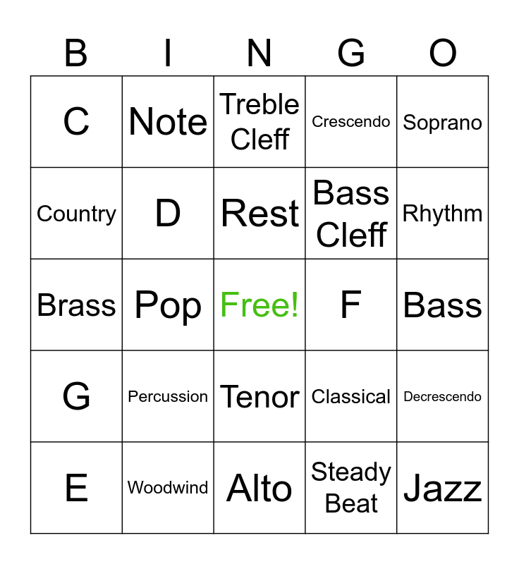 This bingo card has a free space and 29 words: E, Strings, Pop, Dynamics, C, Treble Cleff, D, Percussion, F, Woodwind, Bass, Jazz, Alto, Steady Beat, Rhythm, B, Tenor, G, Soprano, Brass, Classical, A, Bass Cleff, Country, Crescendo, Note, Decrescendo, Rest and Composer.