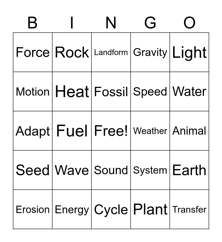 This bingo card has a free space and 24 words: Wave, Energy, Fossil, Erosion, Light, Force, Motion, Rock, Weather, Sound, Speed, Adapt, System, Earth, Heat, Plant, Animal, Landform, Water, Fuel, Transfer, Seed, Gravity and Cycle.