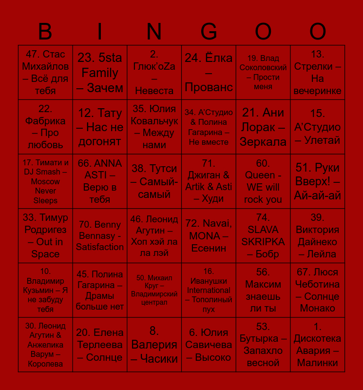 This bingo card has 76 words: Free!, 1. Дискотека Авария – Малинки, 2. Глюк’oZa – Невеста, 3. ВИА Гра – Попытка №5, 4. Фабрика – Рыбка, 5. Звери – До скорой встречи, 6. Юлия Савичева – Высоко, 7. Серебро – Мама Люба, 8. Валерия – Часики, 9. МакSим – Нежность, 10. Владимир Кузьмин – Я не забуду тебя, 11. Дима Билан – На берегу неба, 12. Тату – Нас не догонят, 13. Стрелки – На вечеринке, 14. Жасмин – Дольче Вита, 15. А’Студио – Улетай, 16. Иванушки International – Тополиный пух, 17. Тимати и DJ Smash – Moscow Never Sleeps, 18. Банд’Эрос – Коламбия пикчерз не представляет, 19. Влад Соколовский – Прости меня, 20. Елена Терлеева – Солнце, 21. Ани Лорак – Зеркала, 22. Фабрика – Про любовь, 23. 5sta Family – Зачем, 24. Ёлка – Прованс, 25. Слава – Одиночество, 26. Градусы – Режиссер, 27. Егор Крид – Самая-самая, 28. IOWA – Маршрутка, 29. Бурито – Ты знаешь, 30. Леонид Агутин & Анжелика Варум – Королева, 31. Дима Билан – Я просто люблю тебя, 32. 5sta Family – Вместе мы, 33. Тимур Родригез – Out in Space, 34. А’Студио & Полина Гагарина – Не вместе, 35. Юлия Ковальчук – Между нами, 36. Иракли – Лондон-Париж, 37. Лолита – Ориентация Север, 38. Тутси – Самый-самый, 39. Виктория Дайнеко – Лейла, 40. Анна Седокова – Сердце в бинтах, 41. Нюша – Воспоминание, 42. Ольга Бузова – Мало половин, 43. Серебро – Kiss, 44. Ани Лорак – Разве ты любил, 45. Полина Гагарина – Драмы больше нет, 46. Леонид Агутин – Хоп хэй ла ла лэй, 47. Стас Михайлов – Всё для тебя, 48. Любовь Успенская – Кабриолет, 49. Григорий Лепс – Я счастливый, 50. Михаил Круг – Владимирский централ, 51. Руки Вверх! – Ай-ай-ай, 52. Стас Костюшкин – Женщина, я не танцую, 53. Бутырка – Запахло весной, 54. Воровайки – Хоп-хоп, 55. Лепс – Рюмка водки, 56. Максим знаешь ли ты, 57. Елена Ваенга – Курю, 58. Виктор Королев – Букет из белых роз, 59. Ирина Круг – Ты сердце и душа, 60. Queen - WE will rock you, 61. Верка Сердючка – Всё будет хорошо, 62. Катя Лель – Мой мармеладный, 63. Татьяна Буланова - мой сой, 64. Света – может нет, а может да, 65. Вирус – Ты меня не ищи, 66. ANNA ASTI – Верю в тебя, 67. Люся Чеботина – Солнце Монако, 68. Демо - солнышко, 69. Ramil’ – Любовь как сон, 70. Benny Bennasy - Satisfaction, 71. Джиган & Artik & Asti – Худи, 72. Navai, MONA – Есенин, 73. Zivert – Эгоистка, 74. SLAVA SKRIPKA – Бобр and 75. Тима Белорусских – незабудка.