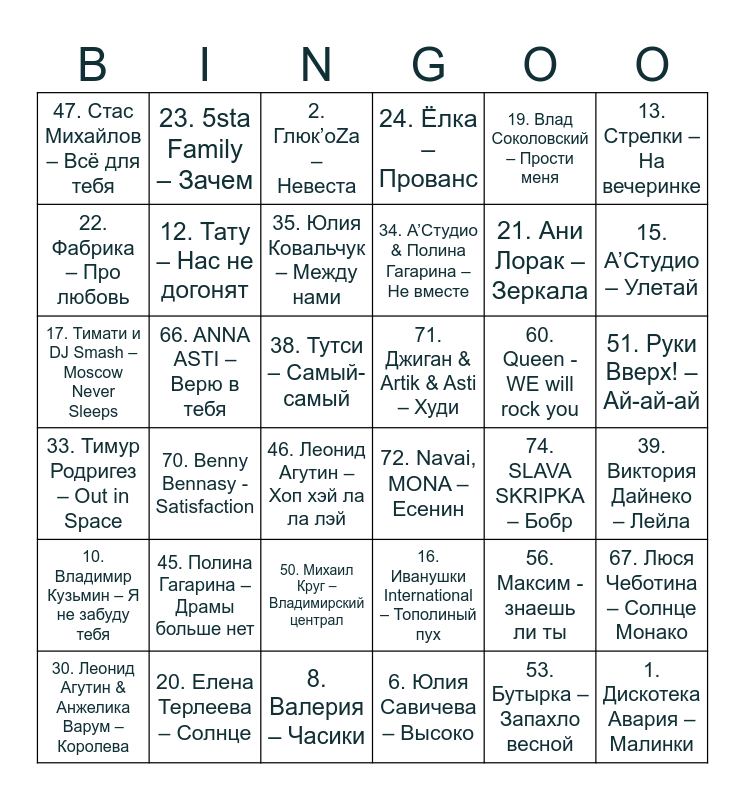This bingo card has 76 words: Free!, 1. Дискотека Авария – Малинки, 2. Глюк’oZa – Невеста, 3. ВИА Гра – Попытка №5, 4. Фабрика – Рыбка, 5. Звери – До скорой встречи, 6. Юлия Савичева – Высоко, 7. Серебро – Мама Люба, 8. Валерия – Часики, 9. МакSим – Нежность, 10. Владимир Кузьмин – Я не забуду тебя, 11. Дима Билан – На берегу неба, 12. Тату – Нас не догонят, 13. Стрелки – На вечеринке, 14. Жасмин – Дольче Вита, 15. А’Студио – Улетай, 16. Иванушки International – Тополиный пух, 17. Тимати и DJ Smash – Moscow Never Sleeps, 18. Банд’Эрос – Коламбия пикчерз не представляет, 19. Влад Соколовский – Прости меня, 20. Елена Терлеева – Солнце, 21. Ани Лорак – Зеркала, 22. Фабрика – Про любовь, 23. 5sta Family – Зачем, 24. Ёлка – Прованс, 25. Слава – Одиночество, 26. Градусы – Режиссер, 27. Егор Крид – Самая-самая, 28. IOWA – Маршрутка, 29. Бурито – Ты знаешь, 30. Леонид Агутин & Анжелика Варум – Королева, 31. Дима Билан – Я просто люблю тебя, 32. 5sta Family – Вместе мы, 33. Тимур Родригез – Out in Space, 34. А’Студио & Полина Гагарина – Не вместе, 35. Юлия Ковальчук – Между нами, 36. Иракли – Лондон-Париж, 37. Лолита – Ориентация Север, 38. Тутси – Самый-самый, 39. Виктория Дайнеко – Лейла, 40. Анна Седокова – Сердце в бинтах, 41. Нюша – Воспоминание, 42. Ольга Бузова – Мало половин, 43. Серебро – Kiss, 44. Ани Лорак – Разве ты любил, 45. Полина Гагарина – Драмы больше нет, 46. Леонид Агутин – Хоп хэй ла ла лэй, 47. Стас Михайлов – Всё для тебя, 48. Любовь Успенская – Кабриолет, 49. Григорий Лепс – Я счастливый, 50. Михаил Круг – Владимирский централ, 51. Руки Вверх! – Ай-ай-ай, 52. Стас Костюшкин – Женщина, я не танцую, 53. Бутырка – Запахло весной, 54. Воровайки – Хоп-хоп, 55. Лепс – Рюмка водки, 56. Максим - знаешь ли ты, 57. Елена Ваенга – Курю, 58. Виктор Королев – Букет из белых роз, 59. Ирина Круг – Ты сердце и душа, 60. Queen - WE will rock you, 61. Верка Сердючка – Всё будет хорошо, 62. Катя Лель – Мой мармеладный, 63. Татьяна Буланова - мой сой, 64. Света – может нет, а может да, 65. Вирус – Ты меня не ищи, 66. ANNA ASTI – Верю в тебя, 67. Люся Чеботина – Солнце Монако, 68. Демо - солнышко, 69. Ramil’ – Любовь как сон, 70. Benny Bennasy - Satisfaction, 71. Джиган & Artik & Asti – Худи, 72. Navai, MONA – Есенин, 73. Zivert – Эгоистка, 74. SLAVA SKRIPKA – Бобр and 75. Тима Белорусских – незабудка.